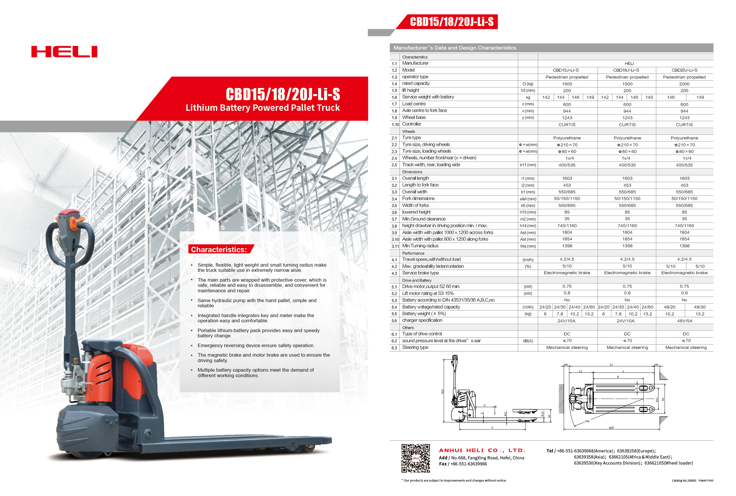 Nábízíme NOVÝ elektrický paletový vozík HELI CBD15J-LI-S - záruka ,nosnost 1500 kg, elektrický zdvih, pojezd a manuálním spouštěním vidlic pomocí páčky na oji nebo nožním pedálem. Je poháněn bezúdržbovou lithiovou baterií o kapacitě 24 V/30 Ah, kterou lze nabíjet externě i přímo ve vozíku. U tohoto modelu jsou balanční vyrovnávací kolečka, která zvyšují stabilitu a bezpečnost při manipulaci!